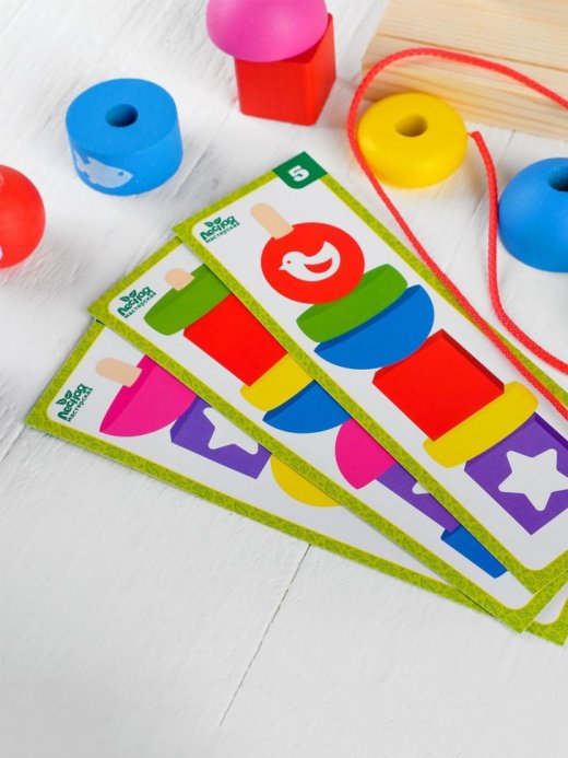 1. Выберите любую карточку с заданием. Установите ее в основании подставки. Начинайте собирать пирамиду, насаживая детали на стержень в соответствии с изображением на карточке.