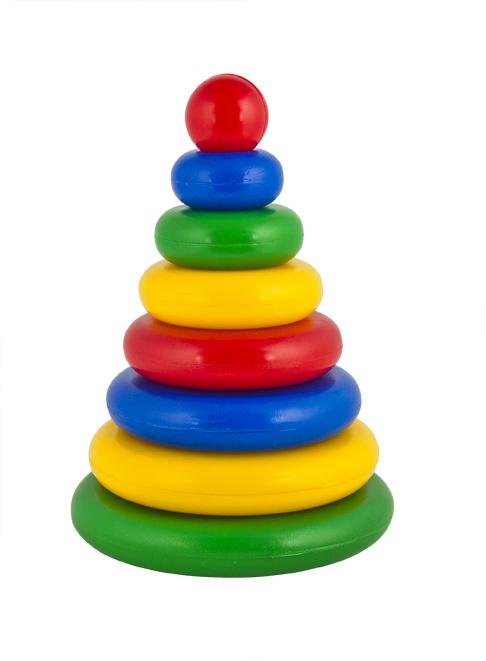 Красочная пирамидка с семью кольцами разного размера и цвета, и вершиной в виде шара.