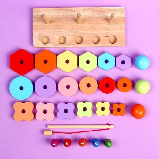 Задача малыша — правильно подобрать детали по цветам или форме и надеть их на столбики. Также на игровом поле есть выемки для магнитных рыбок.