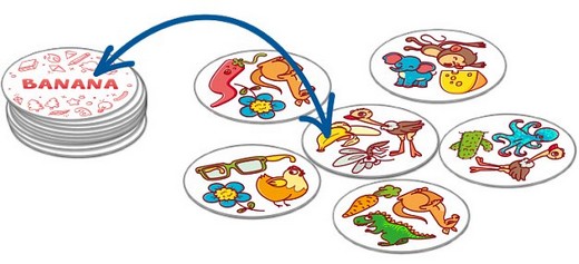 В игровом комплекте 96 фишек-жетонов. С одной стороны фишки — три ярких картинки, с другой написано слово. Фишки разделены цветом на два игровых комплекта: в первом, синем, слова покороче, в красном — подлиннее. Есть три варианта правил: в самом простом читать не нужно — игроки наперегонки находят одинаковые картинки, развивая внимание и концентрацию.