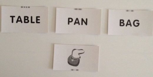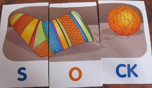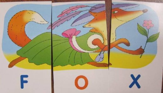 Набор состоит из 48 карточек, которые могут использоваться с двух сторон. Цветная сторона карточек это задание «Учимся читать». Предложите ребёнку из 6-12 карточек выбрать три и составить из них картинку. Собрав картинку, он увидит, как выглядит соответствующее слово по-английски. Произнесите это слово, пусть ребёнок повторит за вами. Обратите его внимание на запись слова, попросите определить, как читается выделенная часть.