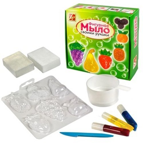 Комплект: мыльная основа, формочки, 3 пищевых красителя по 5 мл (красный, синий, желтый), стек, пластиковый стаканчик, инструкция.