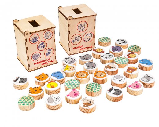 4. Спросите ребенка, чем питаются животные? Расскажите ребенку про хищных и травоядных животных. Попросите "расселить" животных, сортируя фишки по соответствующим коробкам.