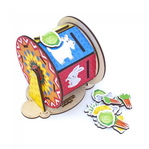 Барабан "Ферма" представляет собой подвижную конструкцию из вращающегося барабана на подставке и комплекта фигурок для сортировки. Игра с барабаном очень интересна: ребенку нужно познакомиться с веселыми изображениями фигурок, сравнить их, посчитать, рассортировать и вставить в соответствующие прорези на корпусе.