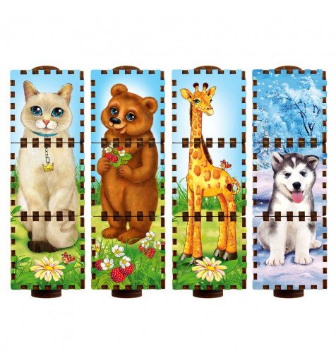 Игра состоит из стержня, на котором расположено три вращающихся кубика. Необходимо собрать собачку, мишку, жирафа или котика, покрутив кубики и выбрав для них подходящие животик, лапки и мордочку. Кубики отлично тренируют память, развивают логическое мышление, внимание и мелкую моторику у деток.