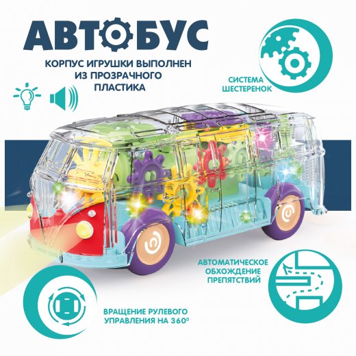 Разноцветные шестерёнки весело крутятся в прозрачном корпусе автобуса!