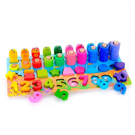 Игрушка позволяет ребенку подбирать соответствующие цифры, знаки и фигуры, изучать цвета, собирать десять пирамидок с кольцами по цветам и количеству, изучать счет от 1 до 10, играть в магнитную рыбалку. Развивает мелкую моторику, координацию, пространственное мышление, распознавание цветов и форм.