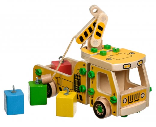 В комплект входят 16 деревянных деталей для сборки автомобиля, винты и отвертка, 4 деревянных кубика, изображающие груз.
