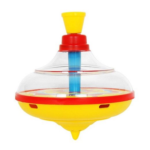 Верхняя часть корпуса юлы изготовлена из прозрачного пластика, остальные элементы - из цветного, а заводной механизм - металлический.