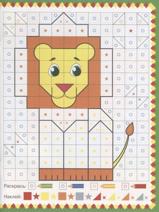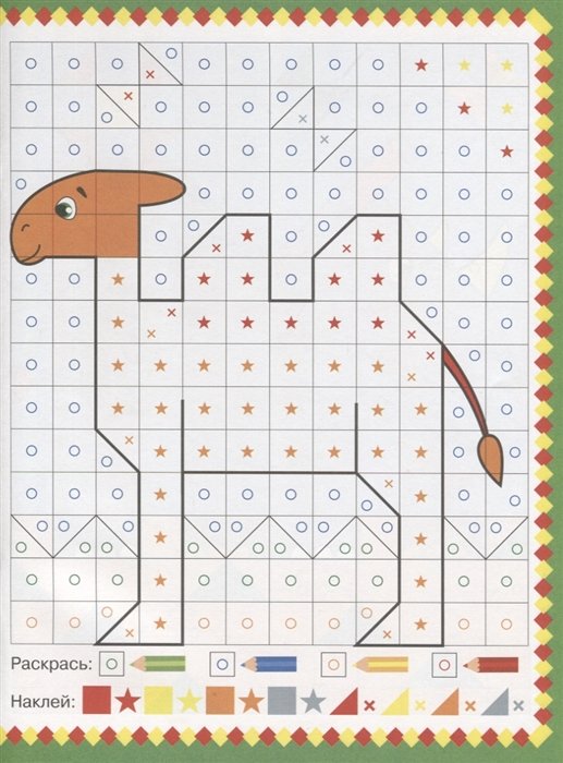 Играя с чудесной книжкой, каждый малыш может создать своими руками чудесные картинки животных. На контурных формах есть звездочки и крестики определенных цветов, которые показывают, какой тип наклейки надо нанести на основу. Кружочки обозначают, что данную зону можно раскрасить цветными карандашами. Ребенку понравится изучать окружающий мир в игровой форме.