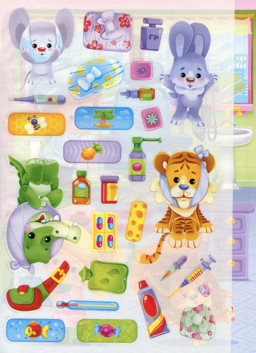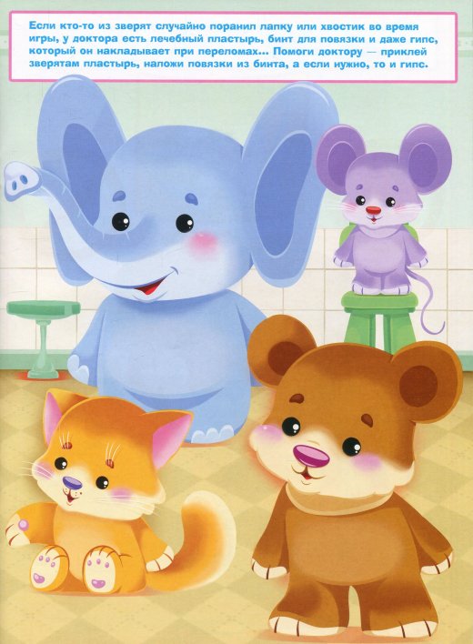 Не ограничивайте фантазию вашего малыша, ведь наклейки в книжке многоразовые, поэтому можно клеить их снова и снова. Придумывайте вместе с ребенком интересные истории про доктора и разных зверят. И вы получите море удовольствия, играя с этой яркой развивающей книгой.