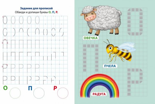 Ребёнку предлагается по точкам обвести буквы, а затем повторить их уже самому, наклеить стикер-мозаику на силуэт букв и пофантазировать, приклеивая животных и разные предметы на картинку. Каждая страница содержит набор букв алфавита, прописей и тематических картинок к ним. Предложенная в книге методика развивает письменные навыки, творчество и фантазию.