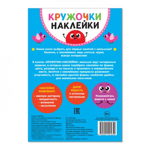 Развивающие наклейки-кружочки пригодятся при обучении малышей важным навыкам. Книга «Наклей по образцу» направлена на тренировку цветовосприятия, запоминание оттенков и понятий «большой — маленький».