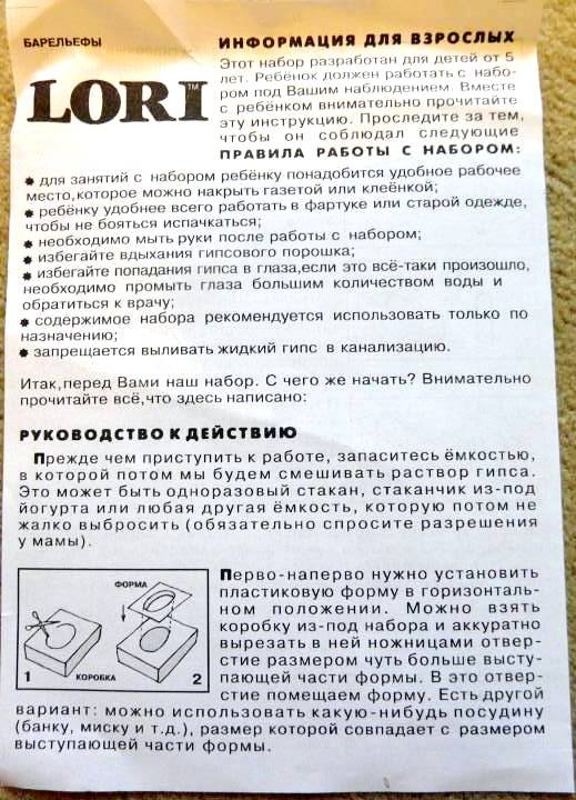 Состав набора: формы для отливки, гипс, краски, кисть, инструкция.