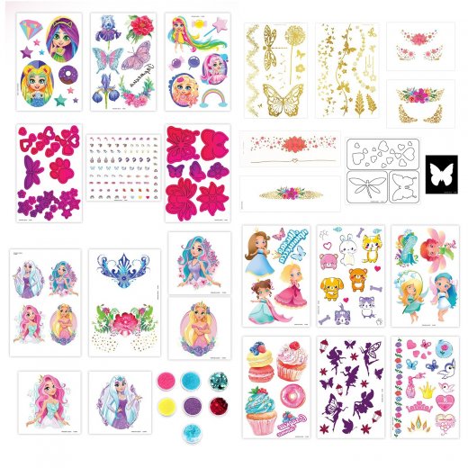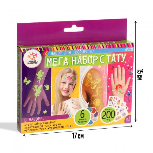 Меганабор с тату — это возможность для каждой юной модницы дополнить свой образ. Ребёнок сможет проявить креативность и добавить блёстки к своим переводным татуировкам, чтобы выглядеть неотразимо.