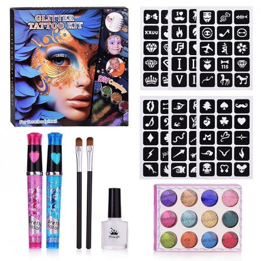 В наборе: трафареты 15 шт, блёстки 12 оттенков, клей 1 бутылек, ручи для блекс тату - 2 шт, набор кисточек для нанесения тату