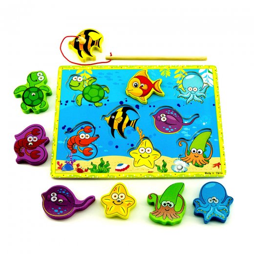 Магнитная рыбалка "Море в ассортименте" представляет собой деревянную рамку, в которую определенным образом, вкладываются элементы - морские обитатели. Фигуры морских животных легко узнаваемы. У каждой детали есть металлическая заклепка, за которую её можно поймать с помощью магнитной удочки.