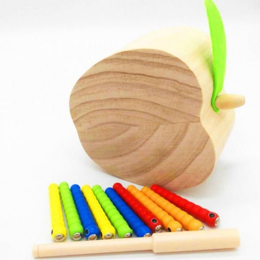 Магнитная рыбалка "Червячки в яблоке" - веселая игра для малышей от 1,5 лет. В комплекте деревянный сундучок в форме яблочка, в нем 10 дырочек, в которых прячутся 10 разноцветных червячков с магнитными головками и "волшебная" палочка, тоже с магнитным наконечником. Червячки пяти цветов (каждого цвета по паре). Задача простая: с помощью магнитной палочки нужно поймать всех червячков, а потом посадить их обратно в норки. Это не так просто, как кажется, и требует большой сосредоточенности и меткости.