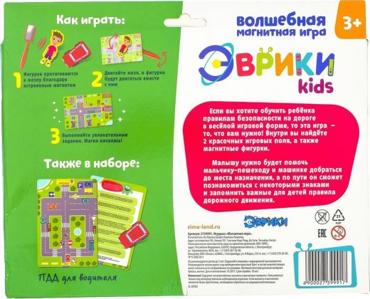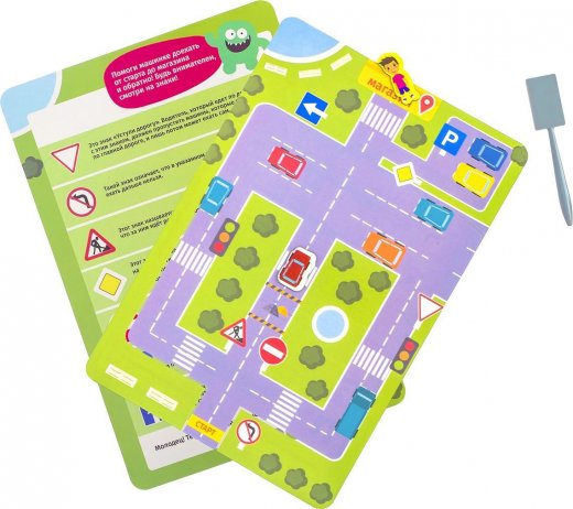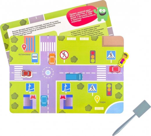 Если вы хотите обучить ребёнка правилам безопасности на дороге в весёлой игровой форме, то эта игра – то, что вам нужно! Внутри вы найдёте 2 красочных игровых поля, а также магнитные фигурки. Фигурки кладутся на поле, снизу подносится специальный магнитный жезл – и фигурки двигаются вместе с ним, словно по волшебству! Малышу нужно будет помочь мальчику-пешеходу и машинке добраться до места назначения, а по пути он сможет познакомиться с некоторыми знаками и запомнить важные для детей правила дорожного движения.