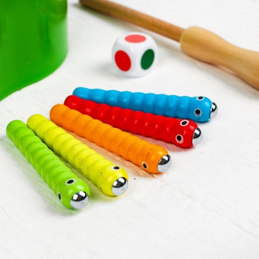 Магнитная рыбалка "Спелое яблочко" - веселая игра для малышей от 1,5 лет. В комплекте деревянная основа в форме яблочка, в нем 10 дырочек, в которых прячутся 10 разноцветных червячков с магнитными головками, кубик и "волшебная" палочка, тоже с магнитным наконечником. Червячки пяти цветов (каждого цвета по паре). Задача простая: с помощью магнитной палочки нужно поймать всех червячков, а потом посадить их обратно в норки. Это не так просто, как кажется, и требует большой сосредоточенности и меткости.
