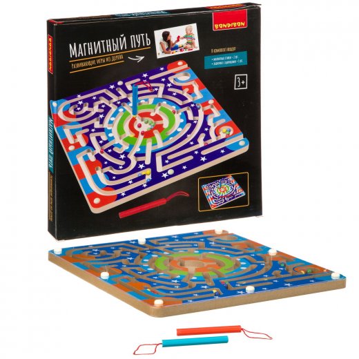 Развивающая игра из дерева "Магнитный путь Bondibon" в игровой форме развивает у детей логическое и образное мышление, зрительную память, мелкую моторику, координацию движений, глазомер, готовит руку к письму, обучению счету, цифрам, цветам.