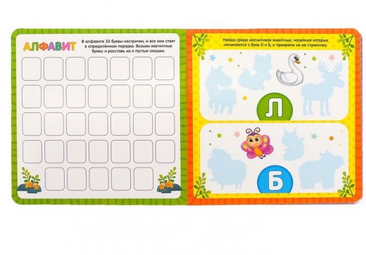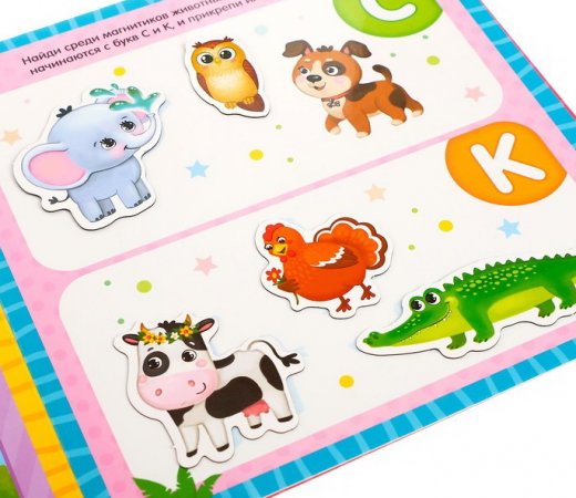Яркая книга-игра с магнитными страничками и фигурками поможет малышу запомнить буквы. Учить алфавит с такой книгой весело и интересно!