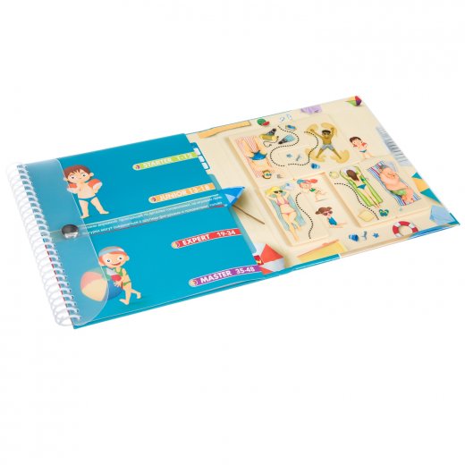 Суть магнитной головоломки в том, чтобы помочь малышам дойти до своих друзей и пляжных игрушек, не наступив ни на кого из отдыхающих. Для этого нужно разместить 5 пластиковых деталей так, чтобы нужные изображения на поле правильно соединились дорожками. У каждого задания есть всего одно верное решение, которое можно посмотреть в конце книжки.