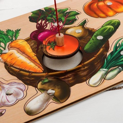 Пазл "Овощная корзиночка магнитики рыбалка" - это деревянный планшет с магнитными вкладышами, который знакомит малыша с полезными плодовыми культурами. Большая тыква, румяная свёкла и яркий томат ждут, когда же вы поймаете их на удочку?!