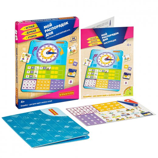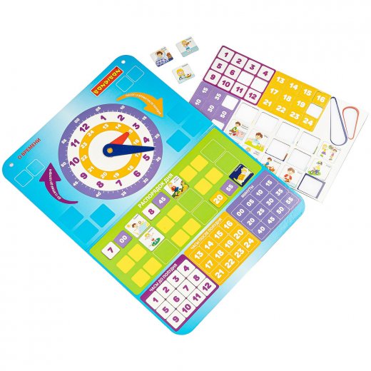 В набор входят 54 магнита с цифрами и событиями режима дня, магнитное игровое поле со стрелками часов, иллюстрированная инструкция.