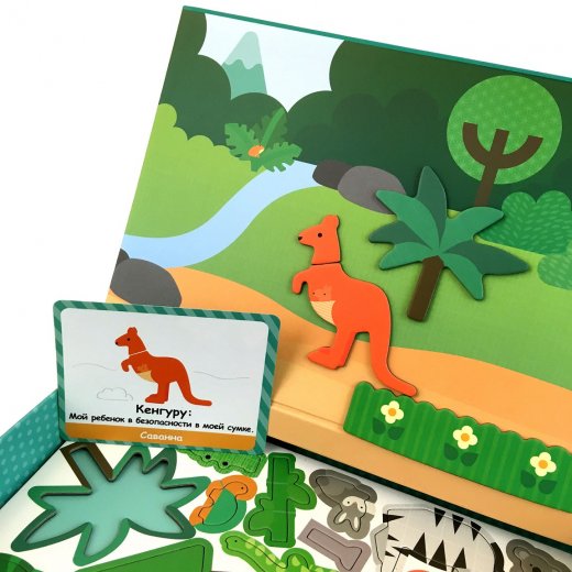 В комплекте вы найдете: 53 магнитных элемента, 8 карточек с заданиями и стирающийся маркер. Упаковка набора трансформируется в игровое магнитное поле и доску для рисования. Используя магниты, ребенок сможет собрать разнообразных животных на соответствующем поле. Используя маркер, получится нарисовать подходящую декорацию.