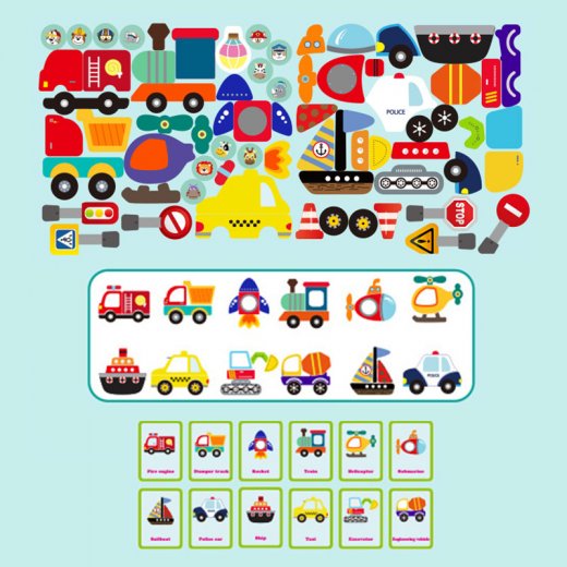 Можно перенести игру за пределы магнитной книги и собирать машинки-самолетики на дверце холодильника или магнитной доске. И тогда котик поедет к жирафику в гости, а слоник поплывет по нарисованной реке на своем кораблике.