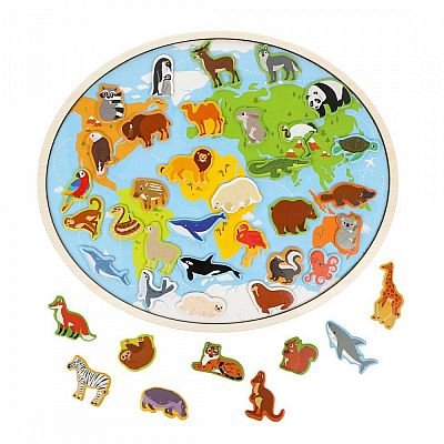 Увлекательная развивающая игра- Магнитная доска Планета Земля познакомит ребенка с разными представителями фауны нашей планеты. Задача ребенка — расположить животных на карте по возможным местам их обитания на разных континентах. У каждого животного есть подсказка в виде обводки, совпадающей с цветом того или иного континента. Фигурки животных крепятся к доске с помощью магнитов. 40 магнитов.