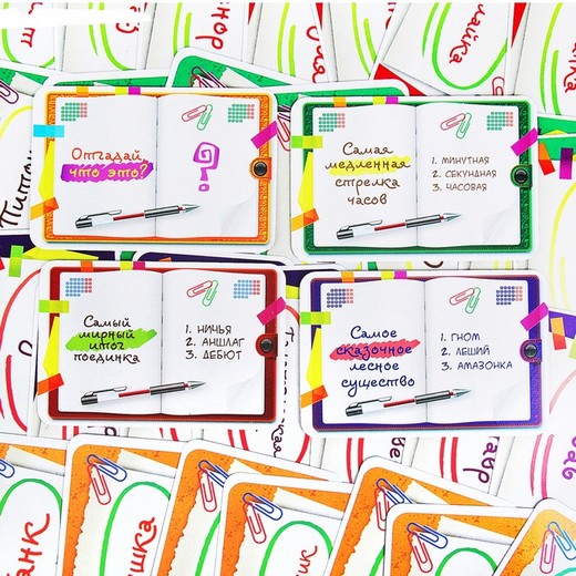 В каждой из них есть вопрос, соответствующий теме, и варианты ответов. Отгаданные карточки игрок (команда) забирает себе.