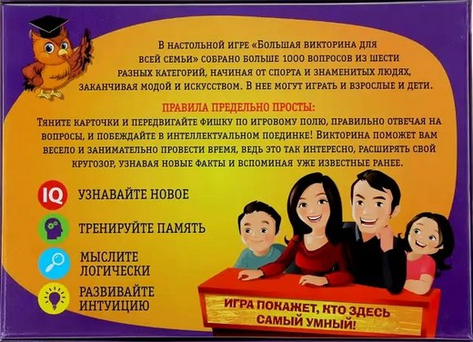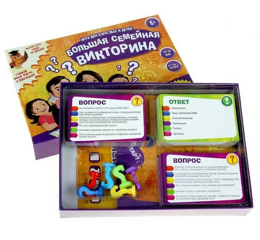 Это семейная игра, в которую рады будут поиграть совершенно разные поколения. Викторина способствует сплочению семьи, а соревновательный характер приобщит к вкусу интеллектуальных побед и познанию себя. Дети учатся новому в принимающей, теплой атмосфере семейной игры.