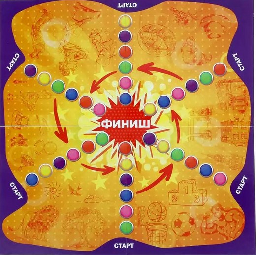 Игроки ходят по очереди. Каждый выбирает себе фишку определенного цвета и устанавливает ее на стартовую позицию. Участники начинают со своей стартовой клетки и стремятся дойти до самого центра поля первым.