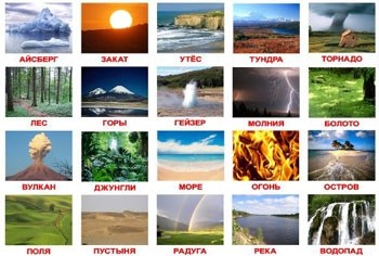 В комплект вошли: лес, река, море, утёс, остров, айсберг, водопад, радуга, огонь, закат, торнадо, гейзер, вулкан, молния, болото, горы, поля, тундра, джунгли, пустыня.Обучение по карточкам даже по 5 минут в день стимулирует развитие различных отделов головного мозга, благодаря чему у ребёнка формируется фотографическая память, он развивается гораздо быстрее сверстников и с рождения открывает для себя мир энциклопедических знаний. Карточки, созданные по методике Глена Домана, будут способствовать развитию речи, пополнению словарного запаса, развитию цветового восприятия, интеллекта, мышления, памяти, скорости реакции.