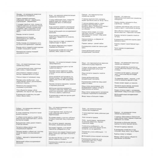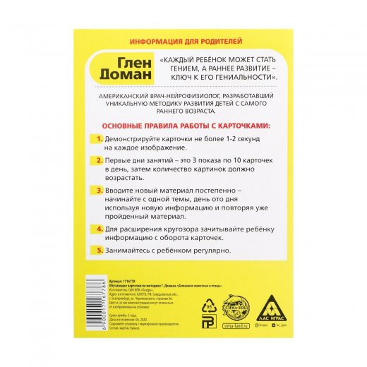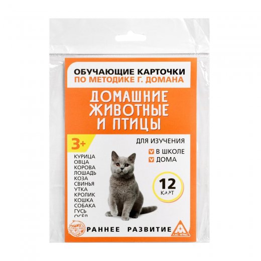 Занятия лучше всего проводить, начиная с 6-месячного возраста малыша. Каждый день показывайте ребёнку карточки друг за другом, начиная с пяти, постепенно увеличивая количество на 3 штуки. Обязательно чётко произносите названия слов. В этом наборе вы найдёте 12 карточек с домашними животными. Название каждого написано красным цветом, как и полагается по методике Домана, и сопровождается фотографическим изображением. На обороте карточек вы найдёте интересную информацию о каждом звере и птице. Когда ребёнок станет старше, зачитывайте ему познавательные факты о животных фермы и домашних питомцах.