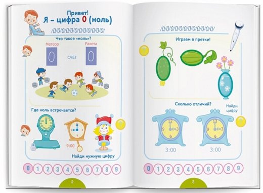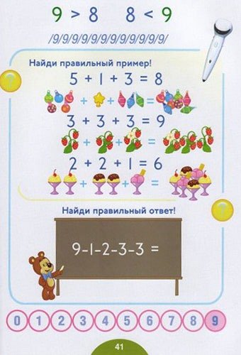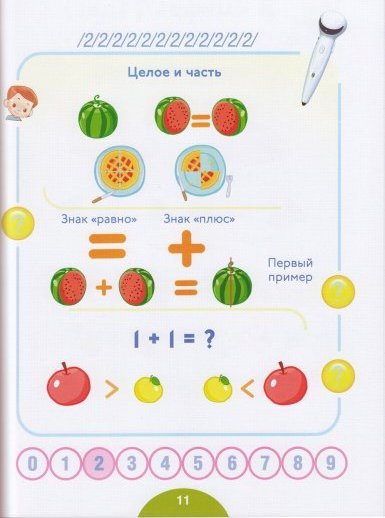 На каждой странице – знак вопроса. Если навести на него ручкой, то она тут же озвучит задание, а после она же скажет, правильное ли было решение. Слушая и запоминая названия, ребенок будет лучше ориентироваться в новом мире чисел и вдобавок разовьет свою речь.