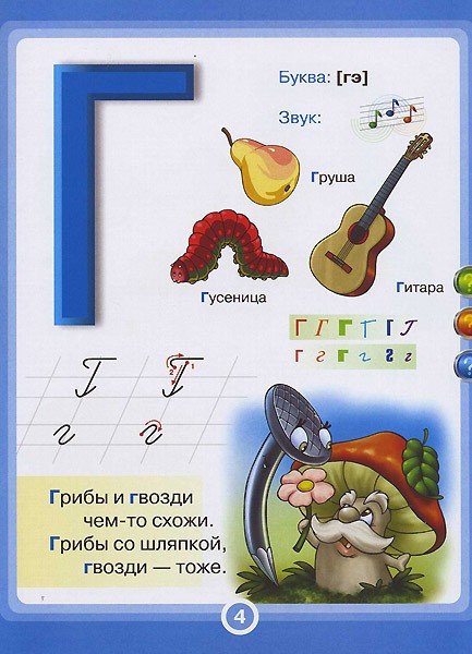 При изучении каждой буквы алфавита, малыш узнаёт что это за буква, как она