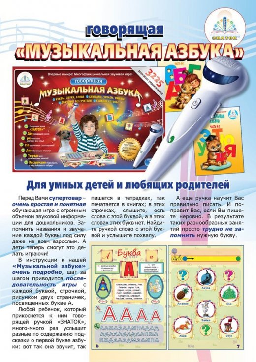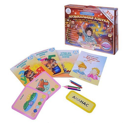Размер упаковки 495 х 415 х 80 мм. Вес 5000 гр. Многофункциональная звуковая игра. 3225 звуковых упражнений. При помощи Говорящей музыкальной азбуки ребенок запомнит слова, буквы, звуки, а также научится читать и писать, узнает много интересного. Ничего не нужно заучивать, а нужно играть с каждой карточкой, с каждой страничкой. Одно прикосновение – и каждая буква, слово, строчка, рисунок заговорят и запоют. И будут играть с вами, сколько вы захотите! На одних карточках оживут и сами расскажут о себе буквы, на других прозвучат веселые звуки и забавные стихи. Хотите поиграть в паровозики? Пожалуйста! Быстро и просто из «говорящих» карточек можно сделать вагончики со словами, буквами, или вагончики с понравившимися вам картинками зверей или фруктов. А хотите – постройте говорящие домики, в которых под одной крышей разместятся и начнут общаться с вами новые друзья – буквы, звуки, слова… Играть с «говорящими» картинками можно где угодно – на столе, на полу, на диване.