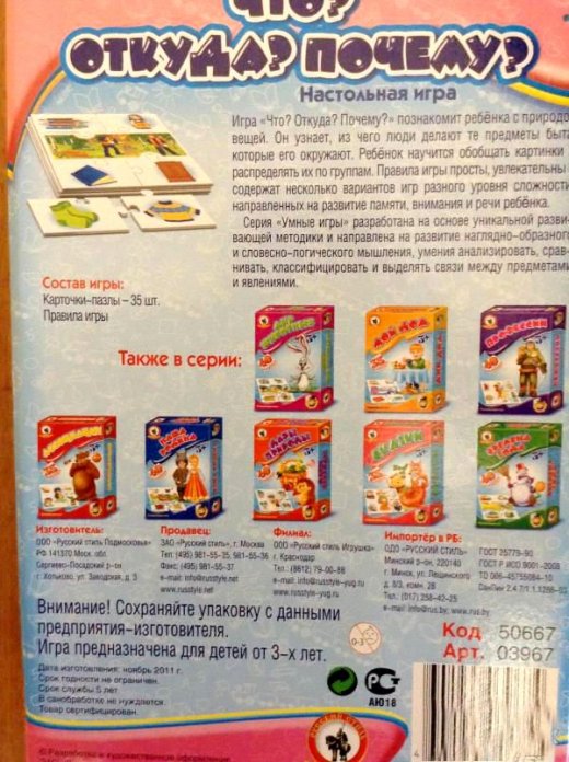 Умные игры Что? Откуда? Почему? – это замечательный набор для маленьких почемучек, который поможет наглядно ответить на многие вопросы ребенка. Благодаря такой развивающей игре в форме макси-пазлов, он узнает, какие предметы изготавливают из металла, стекла, камня, а также хлопка, пшеницы и шерсти. На центральной картинке изображен вид сырья, а на дополнительных нарисованы варианты готовых изделий. Детали хорошо подогнаны друг к другу, а благодаря разному размеру центрального и дополнительных пазлов, ребенок легко сможет найти основную карточку и подобрать к ней боковые. Есть несколько вариантов игр: