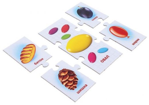 Набор из серии "Умные игры" предназначен для изучения семи основных геометрических форм. Каждый из блоков состоит из пяти деталей пазла, в котором центральная карточка в два раза крупнее боковых и изображает яркую геометрическую фигуру с названием, а дополнительные секции меньшего размера изображают предметы соответствующей формы. Есть несколько вариантов игр: