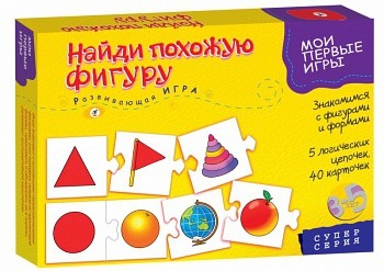 Найди похожую фигуру Мои первые игры – познакомит ребенка с основными геометрическими фигурами. Научит его определять форму окружающих предметов. В состав входит 40 карточек. На 5 из них изображены геометрические фигуры: круг, квадрат, прямоугольник, треугольник, овал. На остальных 35 карточках изображены различные предметы, форма которых легко определяется.