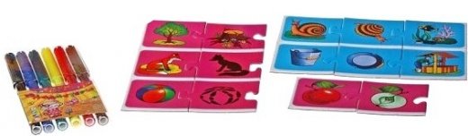 Игра учит различать цвет, форму и размер, соотносить цветное изображение с контурным, находить недостающие детали, соотносить часть и целое.