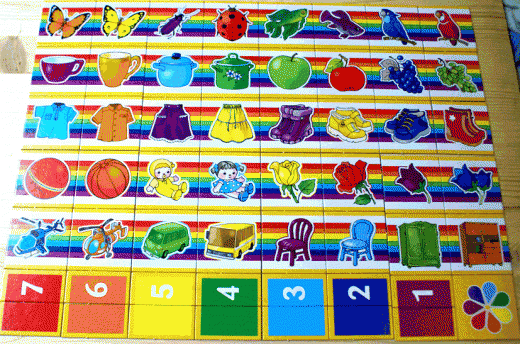 Игра знакомит детей с цветами радуги, способствует развитию внимания, мышления, навыков классификации. Ребенок научится ориентироваться в пространстве, называть группы предметов обобщающим словом, познакомится с цифрами от 1 до 7 и счетом в пределах 7.
