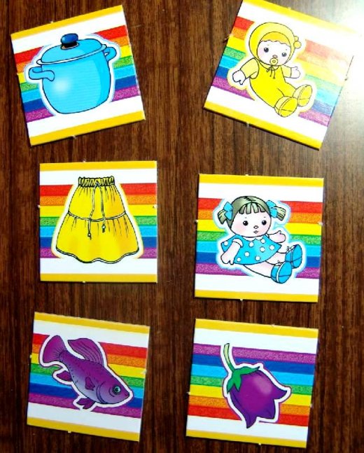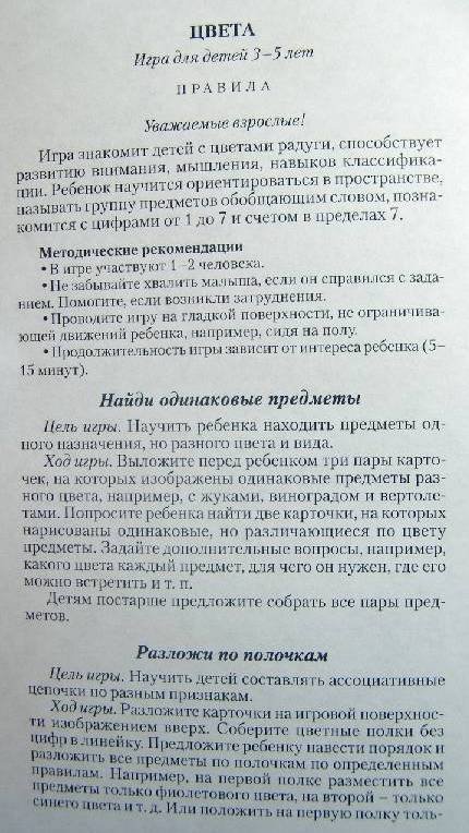 Нужно разложить перед ребенком и предложить ему выполнить разные задания: попросить найти карточки, на которых изображены одинаковые предметы разного цвета, найти картинки с предметами всех цветов радуги и разложить их в том порядке, в котором они встречаются в спектре. С помощью этой игры можно научить ребенка составлять ассоциативные ряды по различным признакам. Например, предложите ему найти все карточки с изображениями насекомых. Играя в "Цвета", можно развить и общие представления малыша о предметах окружающего мира: когда ребенок вытащит карточку, спросите его, для чего нужен предмет, который на ней нарисован, где его можно встретить. Это послужит замечательным упражнением на развитие речи.