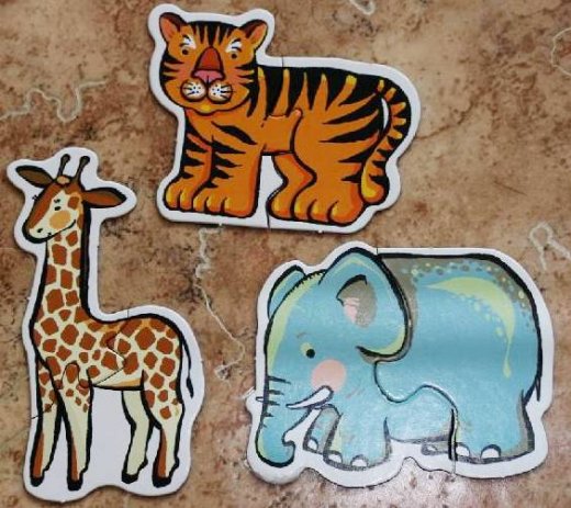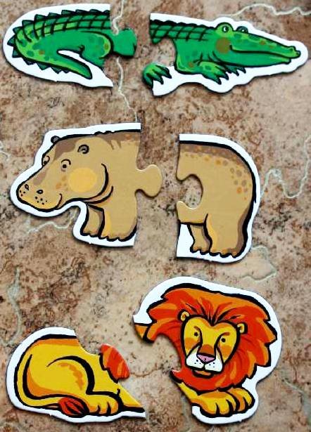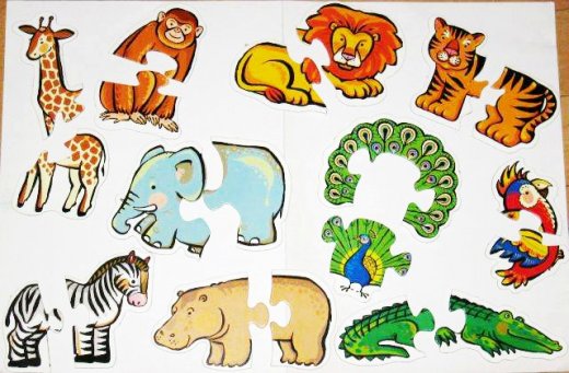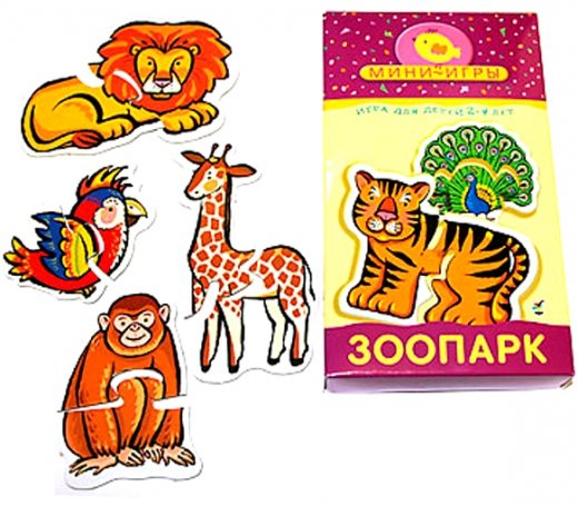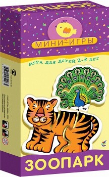 Зоопарк Мини-игры – это пазлы для самых маленьких. В "Зоопарке" — слон, лев, зебра, жираф, тигр, крокодил, бегемот, обезьяна, павлин и попугай. Картонные фигурки зверей, ярко раскрашенные, состоят из двух деталей каждая. Ребенок учится находить недостающие детали, складывать целое изображение из двух частей. Если детали найдены правильно, они плотно соединяются. Ребенок собирает фигурки животных и говорит, как они называются. Так малыш 2-4 лет выучит правильные названия животных. Можно спрашивать ребенка, какого цвета животные, которое он только что назвал. Это поможет вспомнить названия цветов. К игре приложены подробные правила и методические рекомендации, которые очень пригодятся родителям.