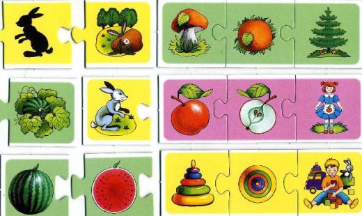 Возьмите 6 карточек, которые можно сложить в 2 цепочки и перемешайте их. Например среди выбранных вами карточек могут быть 3 с изображением зайчика (цветное изображение, силуэт или зверек, сидящий за камнем). Предложите ребенку найти все карточки, на которых спрятался зайчик и соединить их в цепочку. Если выбор сделан правильно, то замки легко соединяться. А из оставшихся карточек можно составить вторую цепочку. Потом разбейте тройки и добавьте к ним новые карточки. Постепенно вводите в игру все больше карточек, вплоть до использования полного комплекса.
