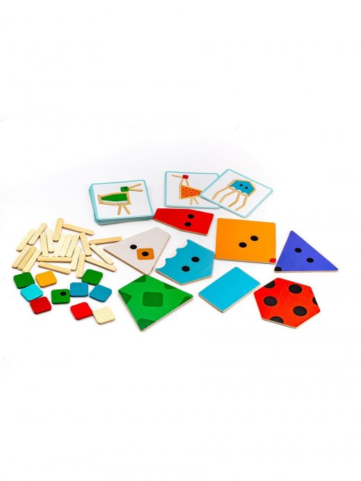 Цель игры: собрать из разноцветных деревянных деталей с разной формой и палочек модель, изображенную на картинке.