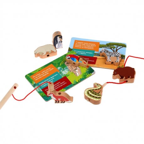 Четвертая игра – шнуровка. А еще в фигурках есть отверстия, чтобы собирать их, как бусы, на длинный шнурок с деревянной ручкой.